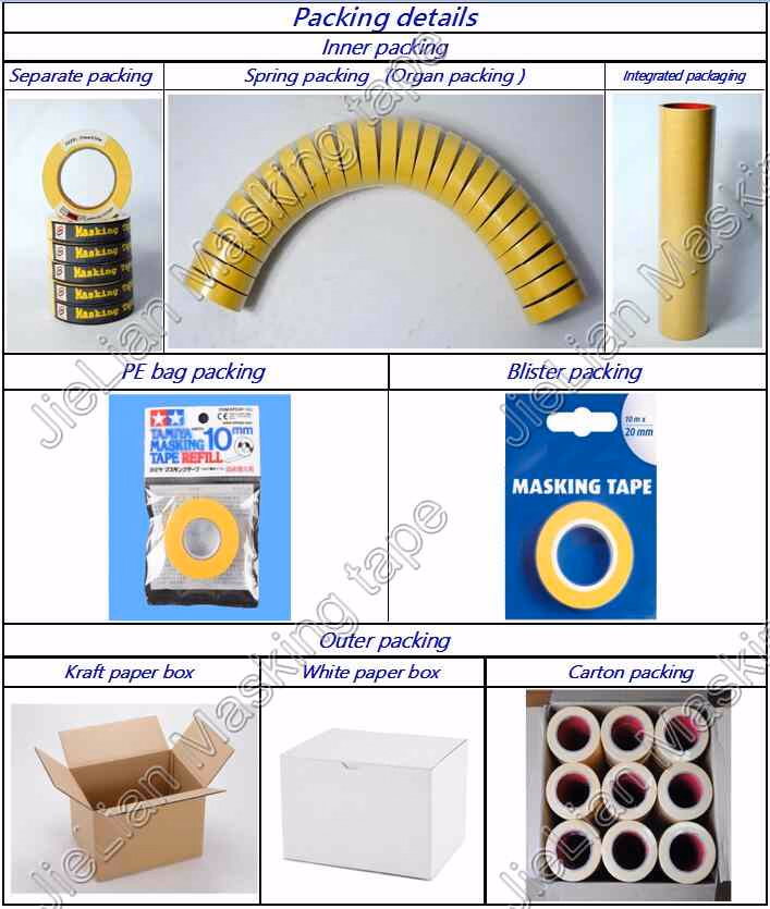 Eine gute Anfangsadhäsion und eine kontinuierliche Klebrigkeit habend, kann das Farbenkrepppapier zu den Oberflächenmaterialien der verschiedenen Arten angebracht werden. Es kann für die Farbenherstellung, -dekoration und -kennsätze zusätzlich zu seiner Dichteleistung auch verwendet werden, die mit Hintergrundumgebung mit verschiedenen Farben leben kann. Es ist in der Farbe mit hoch qualifiziertem Aussehen frisch, also kann es als hoch qualifizierte Schwergängigkeit und Verpackungsmaterial auch verwendet werden.